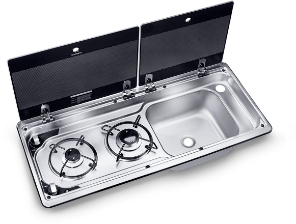 The right-hand sink configuration works well for most layouts, and the 12V ignition means you don’t need matches or lighters to get cooking. It’s a proper two-burner setup that can handle everything from your morning coffee to a full dinner service.