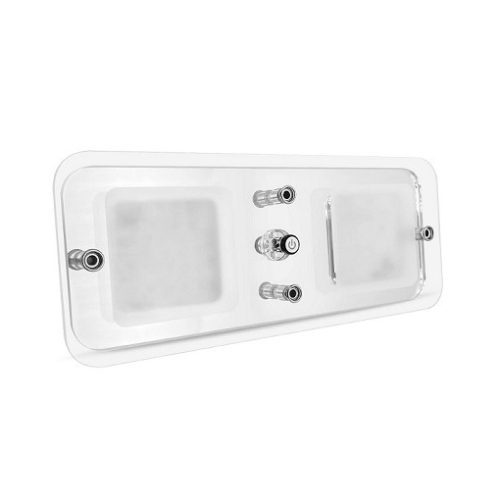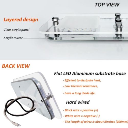 24 super bright SMD chip LEDs • Lighting color: Cool White/blue • Operating voltage: 12V DC • Low power consumption: 4.8W, 400mA • Luminous flux: 330lumens • Light angle: 120 degrees • 120 degrees flat angle light illumination provides additional ambient light • Provides even and soft light distribution without glaring • Inbuilt switch can easily turn on/off the light • Two-phased switch to adjust the light between blue lighting and cool white lighting to meet your different demand. • Memory function means if it is turned off when the blue setting is on, then it will come back with the same setting when it is turned on again. • Surface screw mounting design, caps provided to cover the screws which will leave a clean finish after installation • Long life span reaches 50,000 hours • Easy installation, surface mounted • Weight: 160g • Dimension: 250X108X18.5mm -