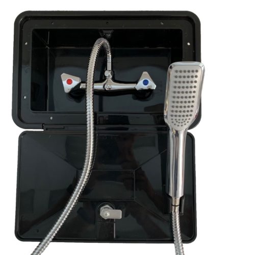 This Compact External Shower Point is an ideal addition to your camper or RV for showers, rinsing off sand after beach visit, hosing pets etc. It uses the unit's existing hot and cold water supplies. Inserting the shower assembly, locks it in place and turns on the water. Temperature adjustment by turning the assembly.